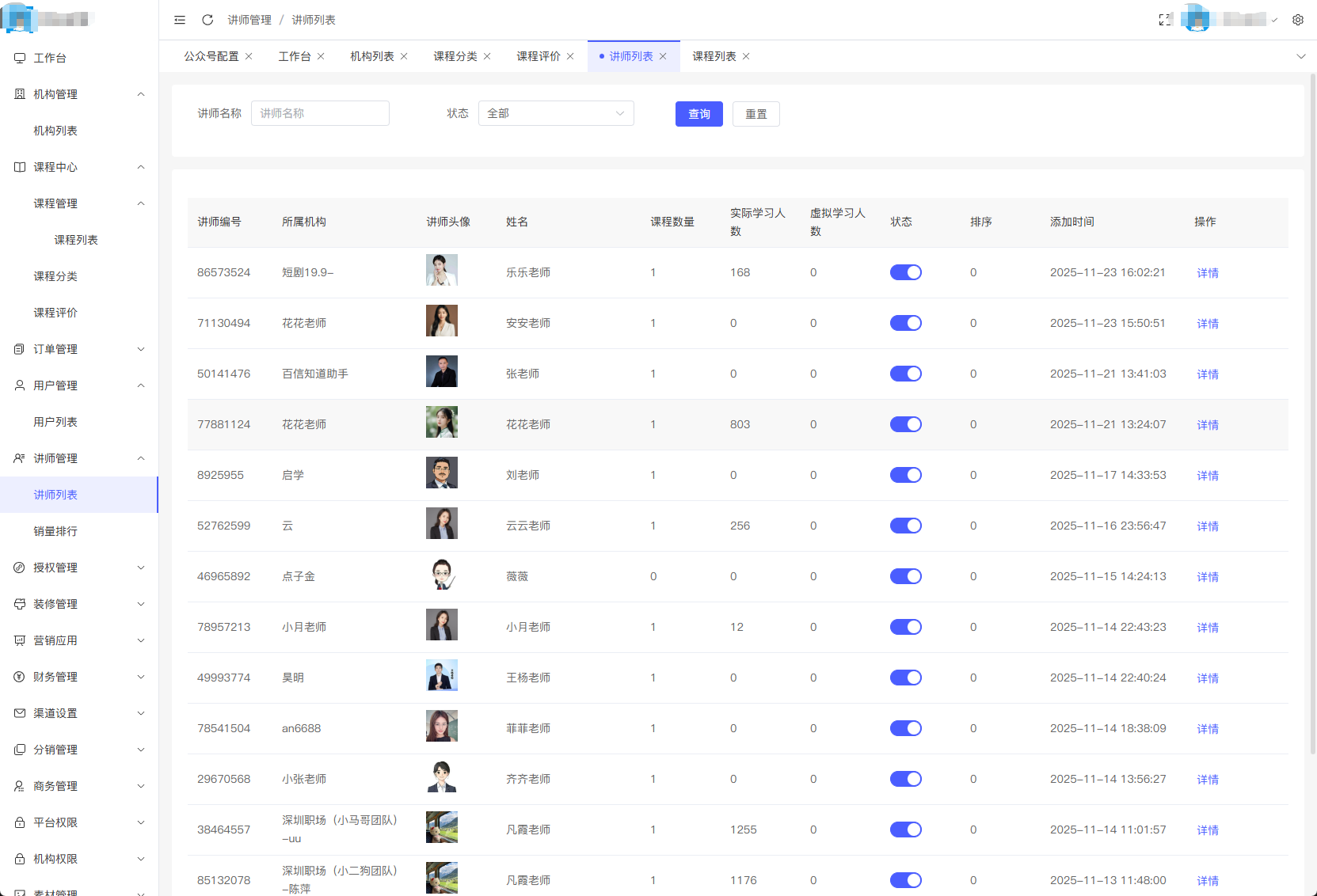每个机构可绑定多个讲师