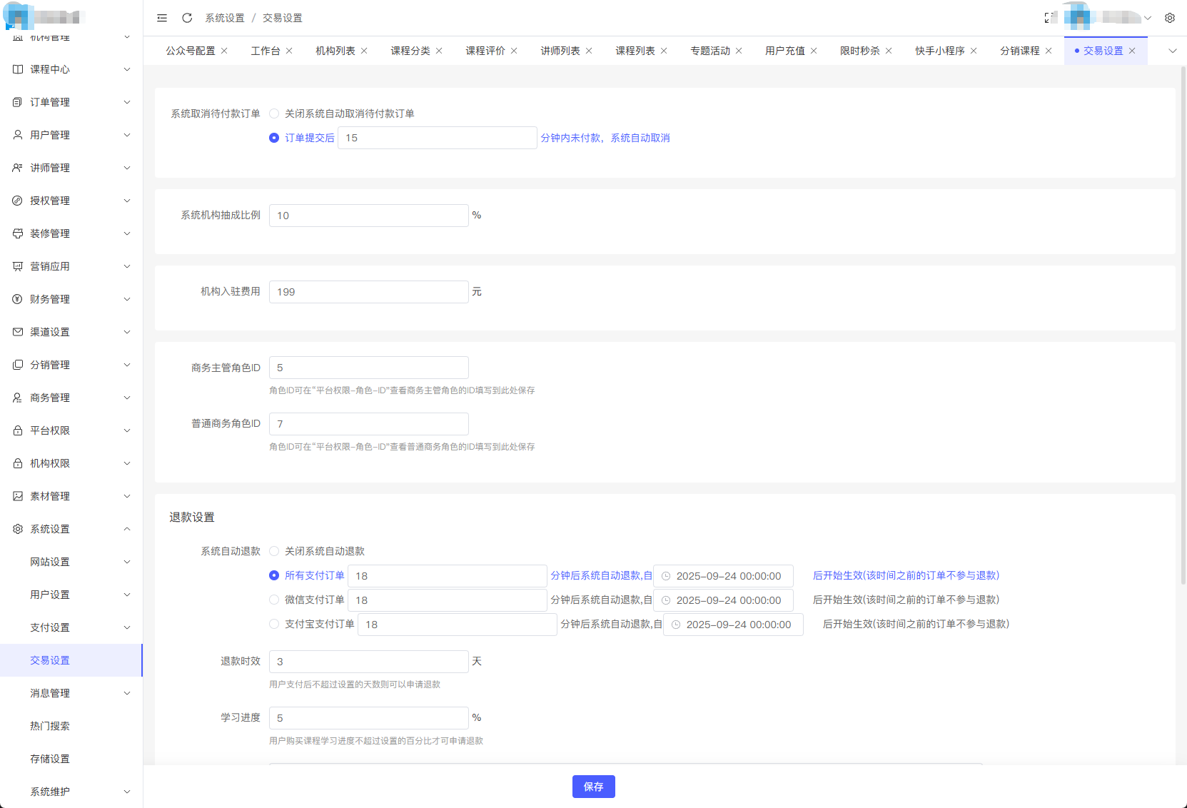 支持设置平台抽成、机构分成、讲师分成